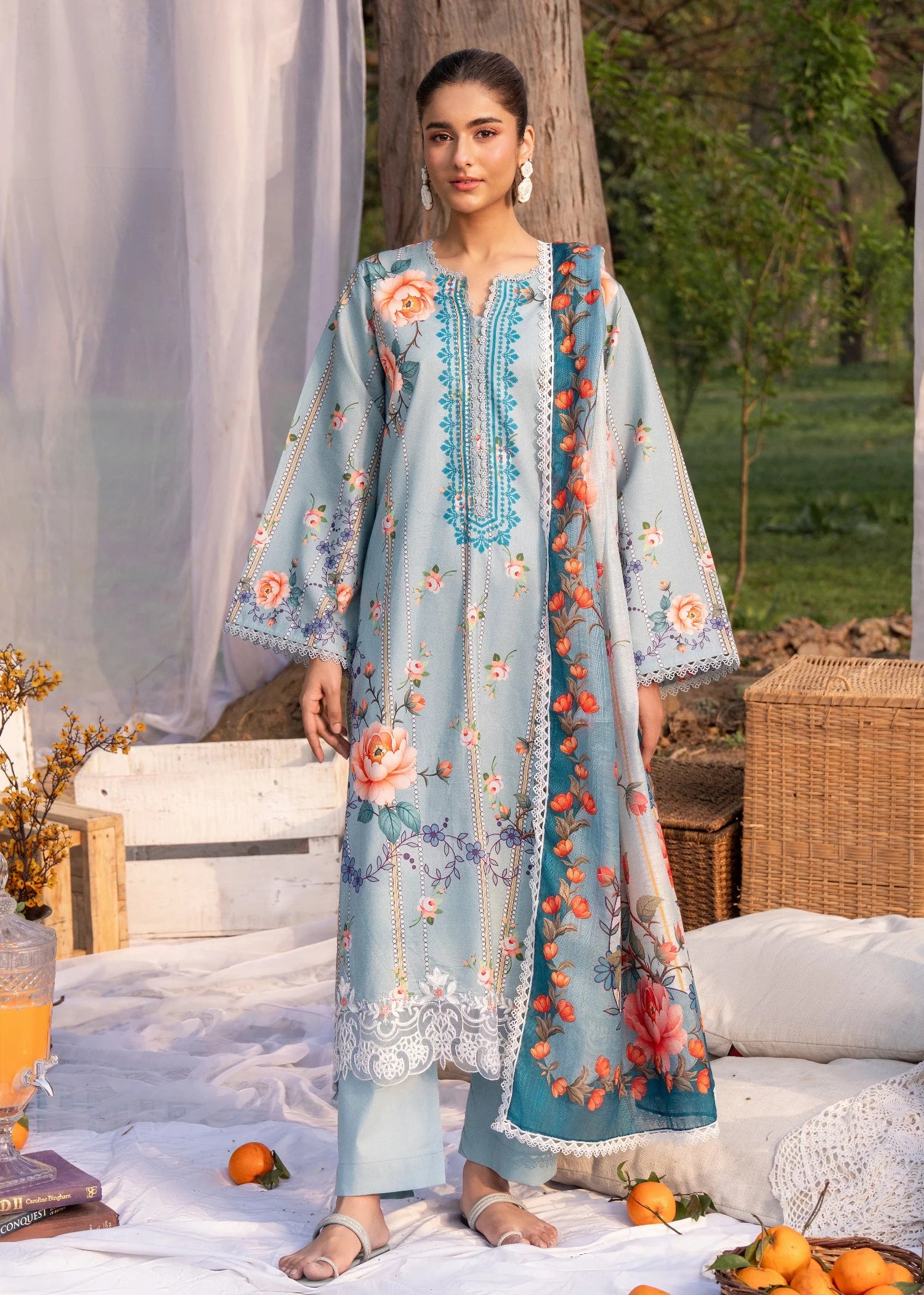 Make this Eid truly special with the exquisite 3-piece dress from the CHANDAN NAGRI collection. Featuring a beautifully printed shirt with intricate embroidery, this outfit exudes elegance and charm. Paired with a printed Chicken Kari dupatta, it adds a touch of sophistication to your celebration. Product Details: Shirt Fabric: Lawn Trouser Fabric: COTTON Dupatta Fabric: ”manar” Dupatta length 90 inches. Stitched Article: Ready to Wear Set: 3-Piece Set Size & Fit: Model: Wearing size small, height 5'7" Sleeve: FULL Shirt Length: Medium Dupatta Length: 86 inches NOTE : Dupatta laces are only for shoot Celebrate Eid in ultimate style with this stunning piece from the CHANDAN NAGRI collection!
