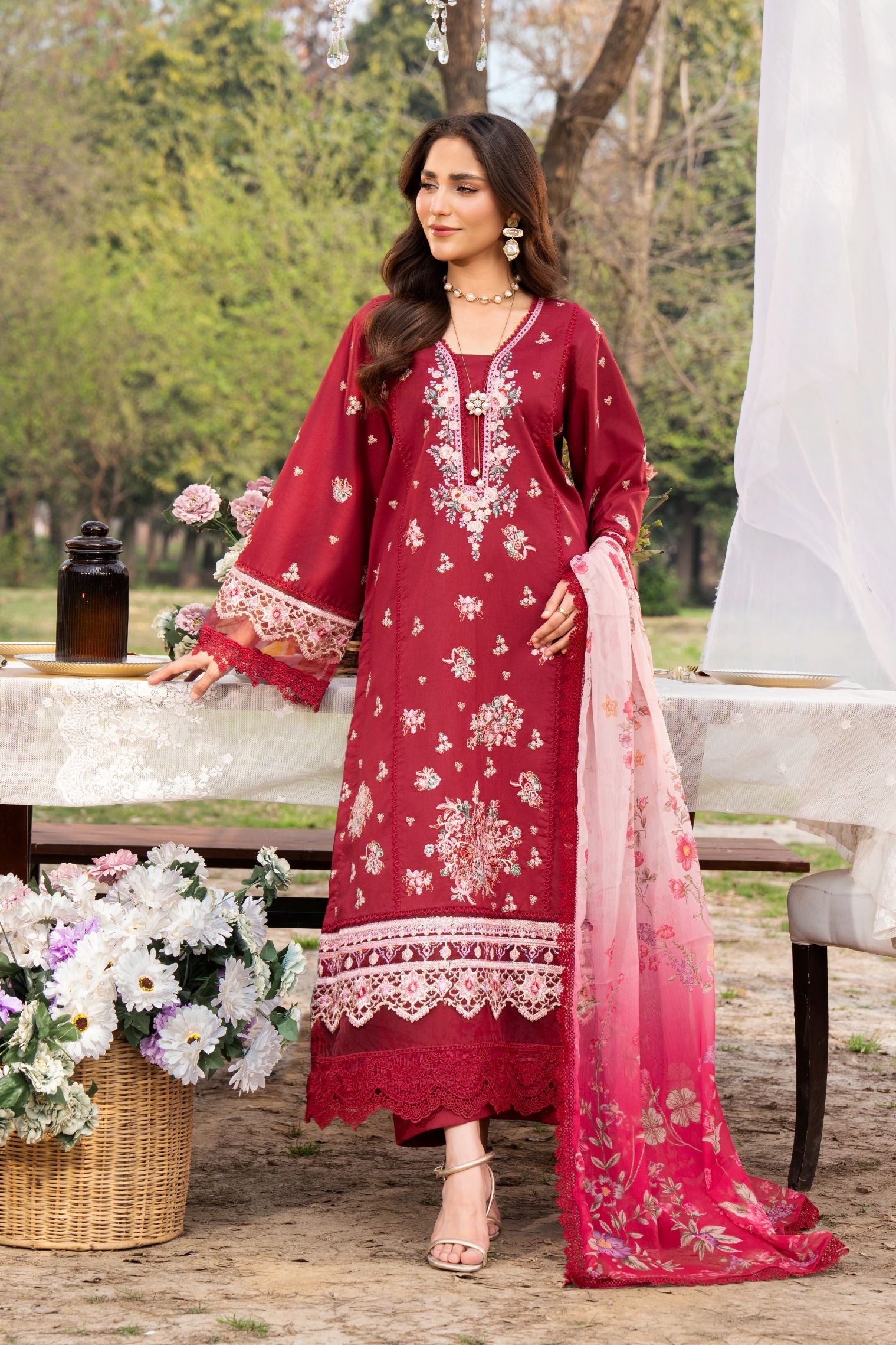 Presenting an elegant 3-piece dress, designed to make your Eid celebrations truly unforgettable. This delicately embroidered shirt, with intricate detailing, is paired with a printed chiffon dupatta, adding a sophisticated touch. Expertly tailored for a flawless fit, this ensemble beautifully blends traditional elegance with a fresh, summery feel. Product Details: Shirt Fabric: Lawn (100% Cotton) Trouser Fabric: Lawn (100% Cotton) Dupatta Fabric: Printed Chiffon (100% Pure) Stitched Article: Ready to wear Set: 3-Piece Set Size & Fit: Model: Wearing size small, height 5'7" Sleeve Length: Full Shirt Length: Medium Dupatta Length: 86 inches For all unstitched articles: Dupatta lace is only for shoot purpose. Make this Eid special and stylish with this exquisite piece from the CHANDAN NAGRI collection!