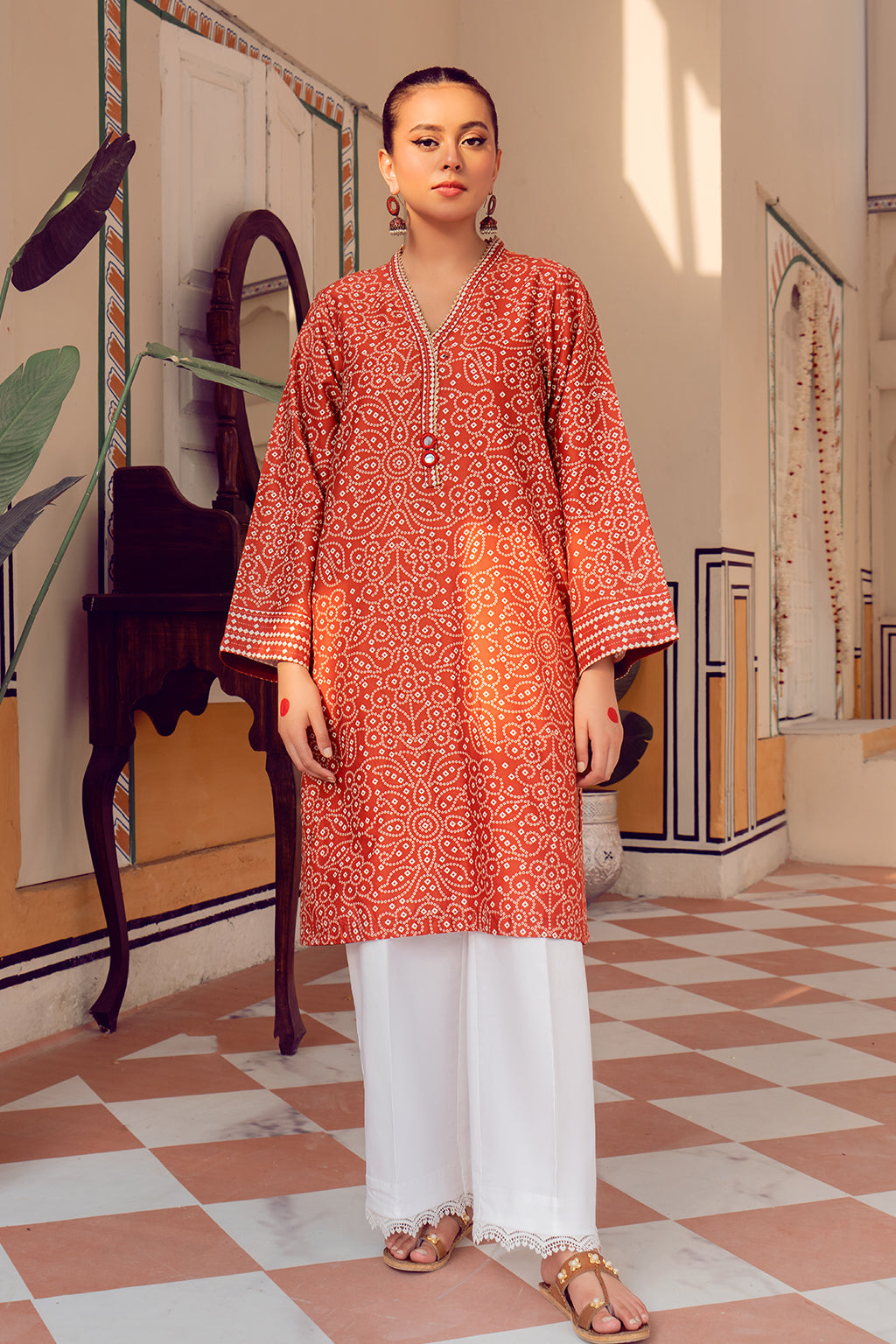 Printed, straight kurta with mirror work details on neckline/ Gotta lace on finishing lines.