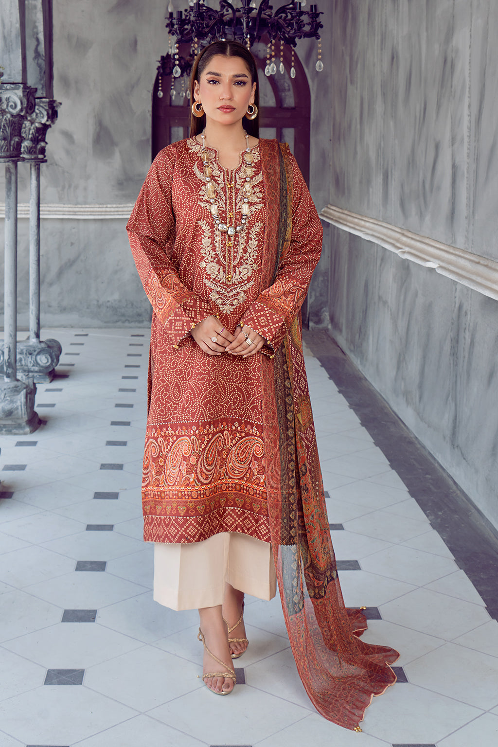 Maroon indeed exudes sophistication and elegance, especially in a three-piece ensemble. The combination of the maroon shade, intricate embroidery, and beautiful tradional paisly pattern printed dupatta creates a unique and eye-catching outfit that is sure to make you stand out during the festivities. Eid is a time for joy and celebration, and wearing such a gorgeous dress will undoubtedly add to the festive spirit.