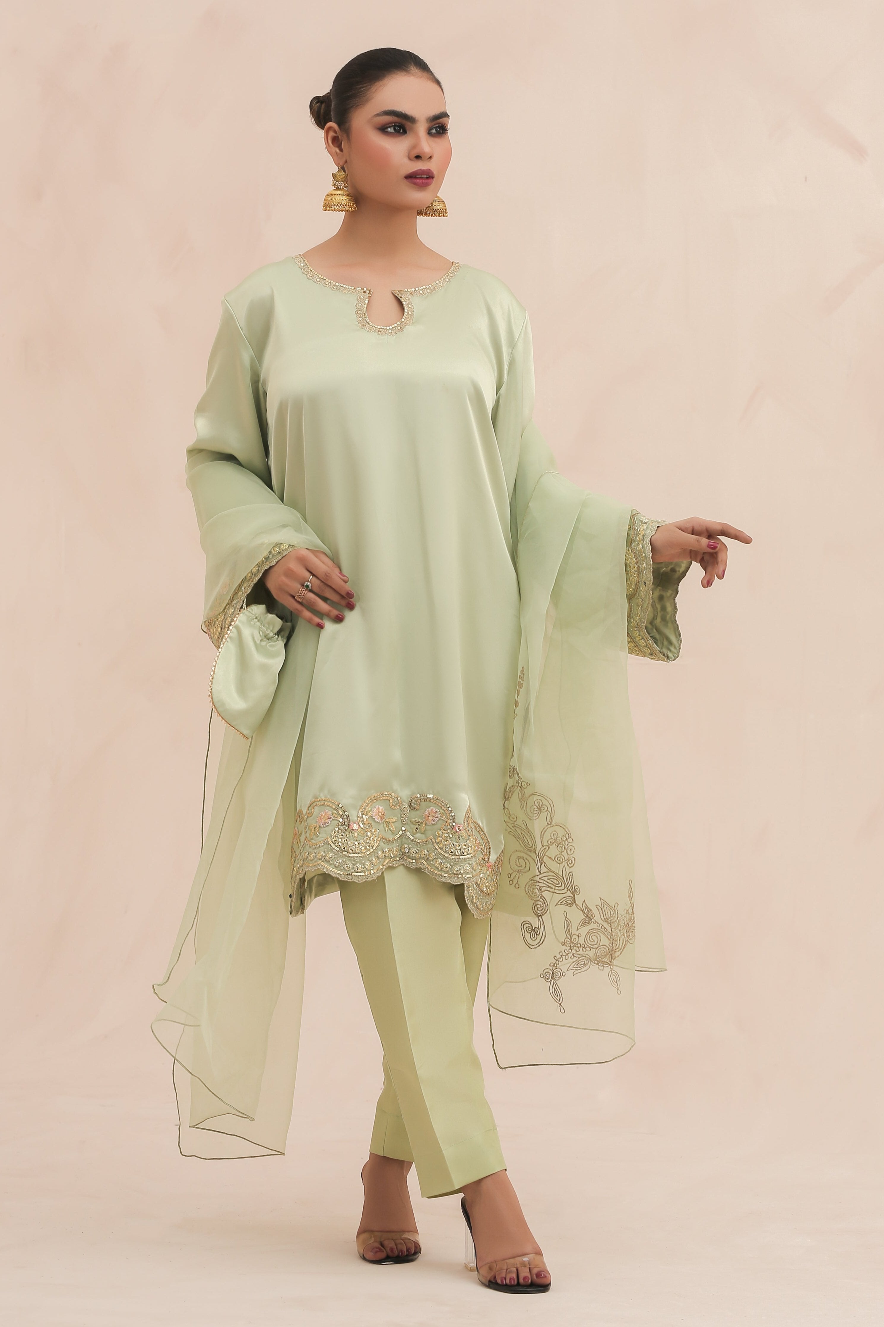 The Pistachio silk 3-piece dress with an organza dupatta is the epitome of elegance and sophistication, making it a timeless choice in current fashion trends. The luxurious silk fabric offers a rich, smooth finish, while the sheer organza dupatta adds a delicate, ethereal touch. Perfect for festive occasions, or upscale events, this outfit blends traditional charm with modern style, capturing attention with its vibrant green hue and graceful draping.