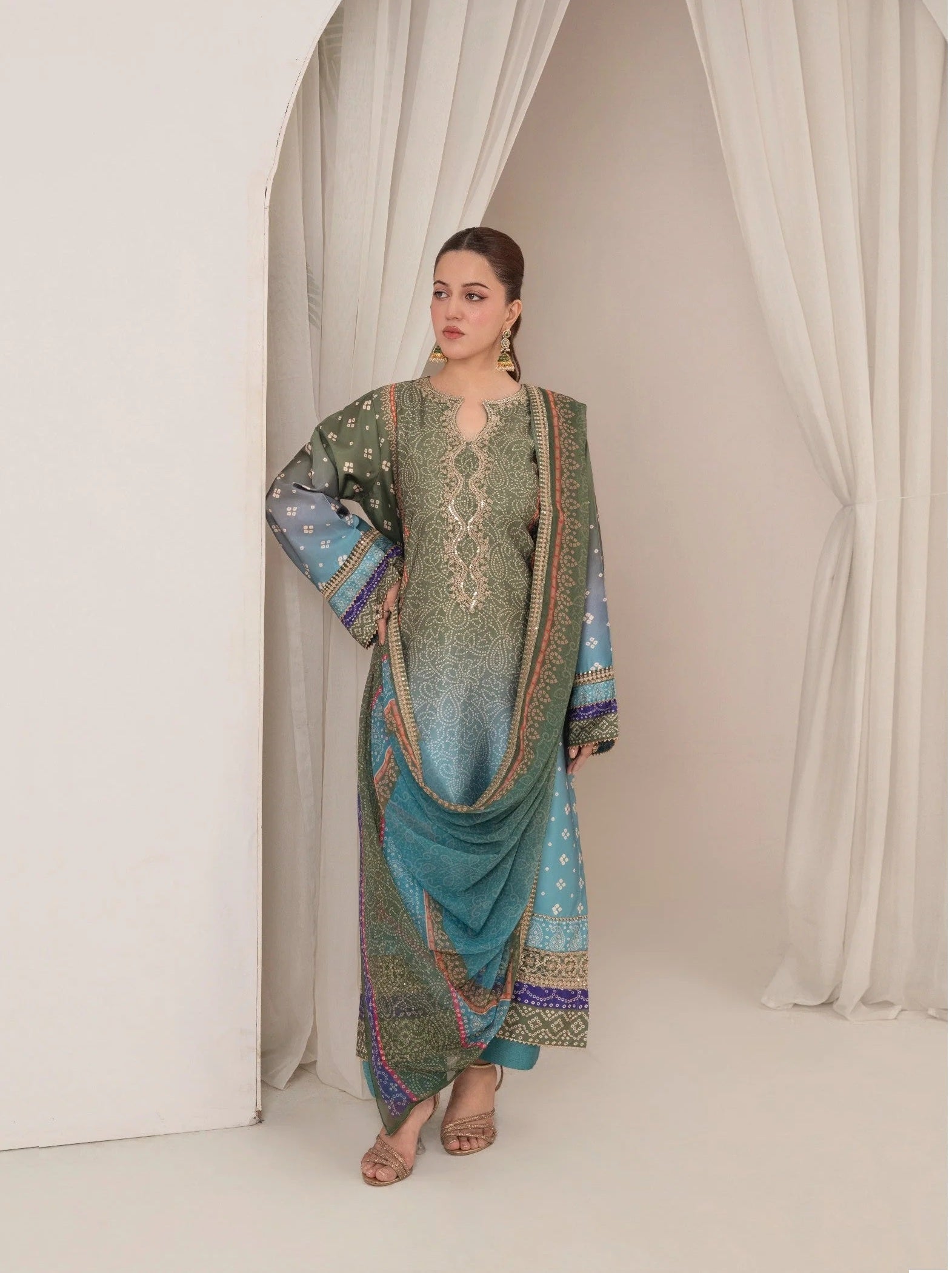 The shirt is adorned with delicate patterns inspired by classic Chunri motifs, while the matching trousers and dupatta complete the look with grace and sophistication.