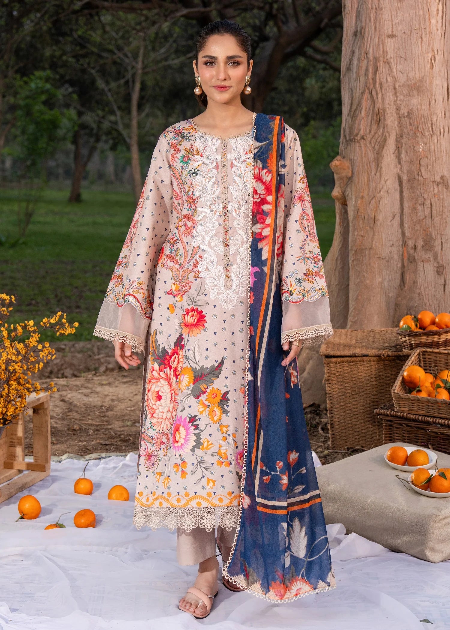 Elysee captivates with its delicate floral lawn fabric, beautifully enhanced by intricate heavy embroidery on the front. Draped in soothing grey pastel hues, this design exudes subtle sophistication and timeless elegance — perfect for those who appreciate refined craftsmanship and graceful style. Fabric: Lawn Trouser Fabric: 100% Cotton Dupatta Fabric: CHIFFON Stitched Article: Ready to Wear Set: 3-Piece Set Model: Wearing size small, height 5'7"" Sleeve Length: Full Shirt Length: Medium DIGITAL-PRINTED AND EMBRIODERED LAWN-FRONT. DIGITAL-PRINTED-LAWN-BACK. DIGITAL-PRINTED-LAWN-SLEEVES. DIGITAL-PRINTED-CHIFFON-DUPATTA. (86 inches) DYED-CAMBRIC-COTTON-TROUSER. Note: Product color may slightly vary a little due to photographic lighting . For stitched products similar laces will be attached in case of non-availability. NOTE : Dupatta laces are only for shoot